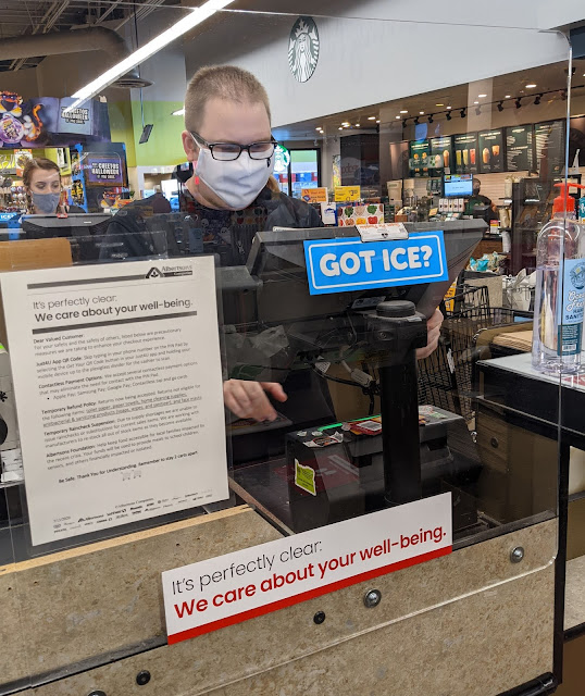 In Albany, Oregon, a Safeway worker, Kobe Brown, follows regulations to keep customers safe during COVID-19. All customers and employees are required, per state mandate, to wear face masks while grocery shopping. Brown cleans the machines and conveyer belt after each customer to keep up with sanitation. Safeway has also included a max capacity of customers to keep up with social distancing.